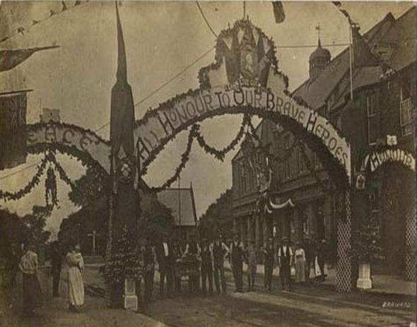 Postcard view of the peace arch next to the Co-op, Station Road, Ashington 1919.JPG