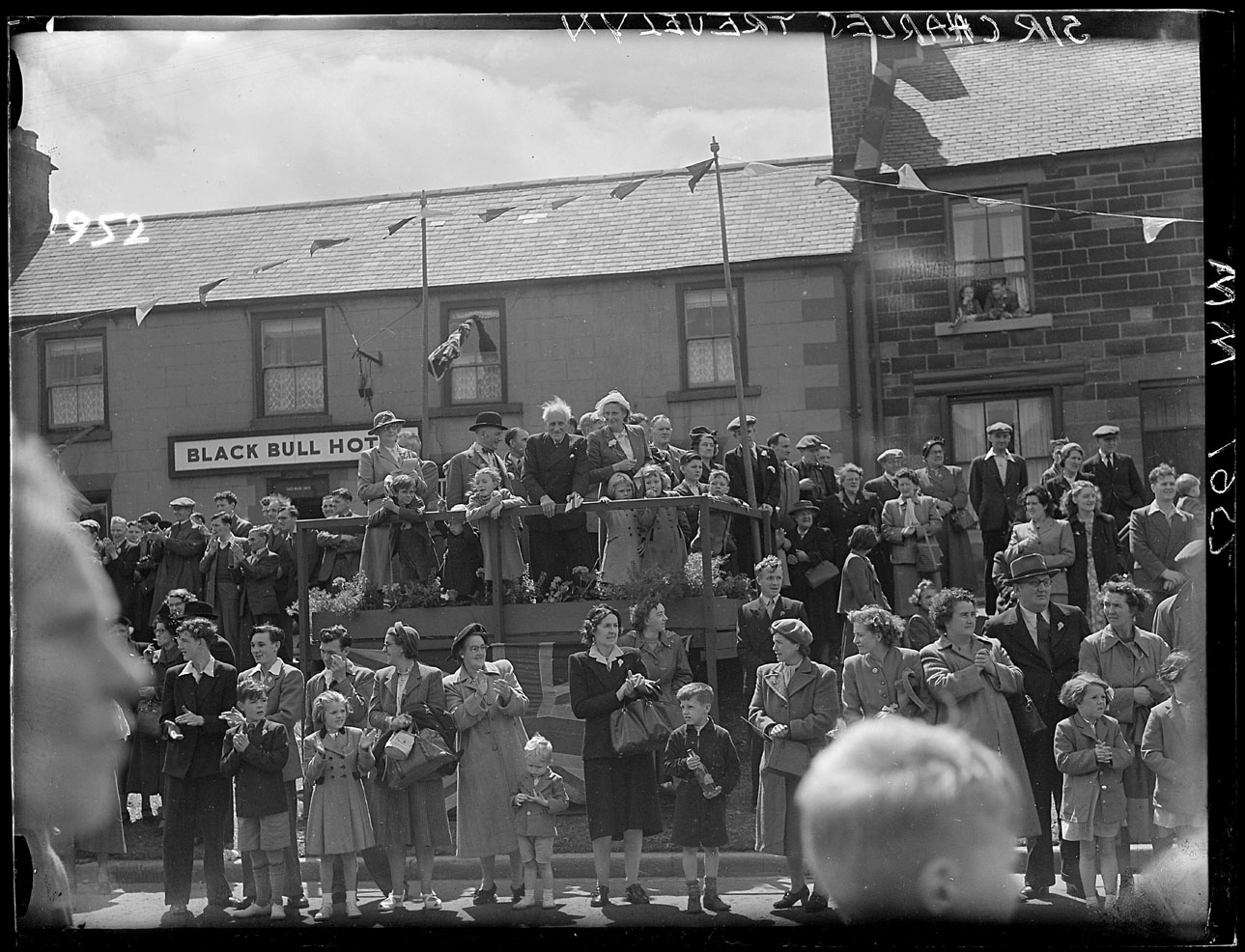 Crowd outside the Black Bull Hotel, Bedlington [c.1950]