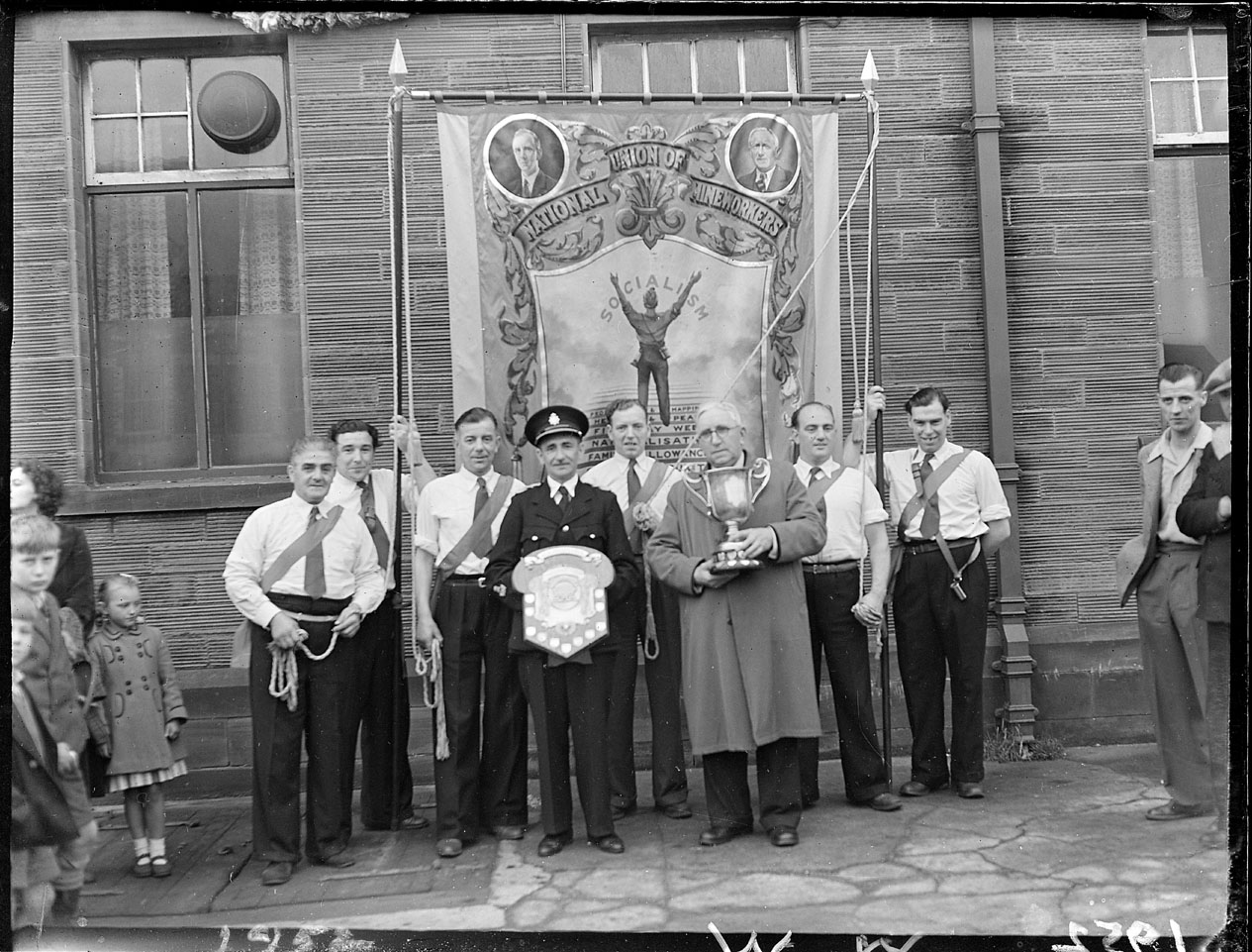 Unidentified men holding the NUM Bedlington Dr. Pit Branch Banner. nd. [c.1950]