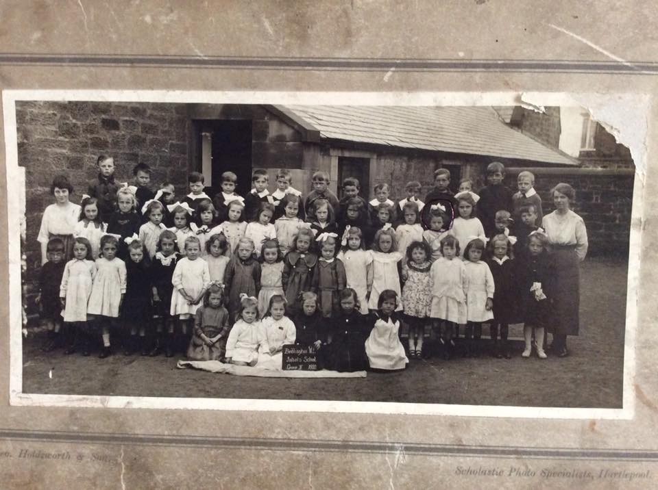 Photo from Facebook Bygone Bedlington Group posted by Michael Myers with the comment :- School photo from St Cuthbert's School, Church Lane 1920. Ringed pupil my mum in law Margaret Ayre.