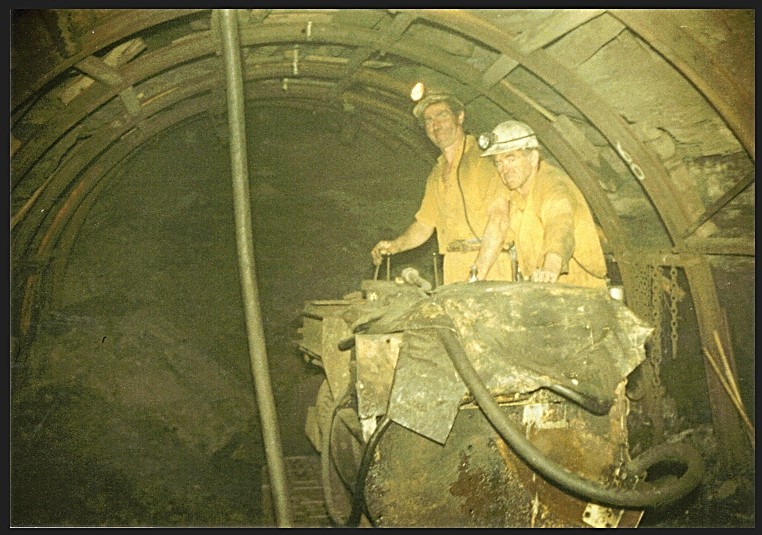 Heh!Heh! As if we had no work to do..!I was busy loading out a full shot ,which had just been fired down in the previous shift.Note the white surveyor's line on the centre of the arches at the top-this line was our only guide to driving a roadway straight underground.