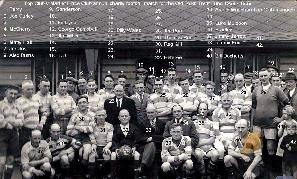Photo and names from Paul Reed whom posted, on the Bedlington Facebook group:- Here is a pic of Top Club v Market Place Club annual charity football match. My Grandad is the big goalie on the right.