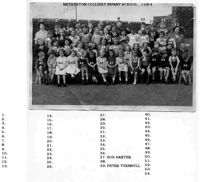 Canny lass 1,440 Posted May 14, 2018 On 09/05/2018 at 20:35, Eggy1948 said: Netherton Colliery Infants School c1954 - photo from Facrebook group Bedlington Remembered member Bob Baxter. Looks like the whole school. Know any of this lot @Canny lass? 8 Confirm Joe Potts 11 Don’t think this is Norman Carr 16 Anne Amos 17 Ann Moore 20 Margaret Morton 21 Christine Ainsley 24 Confirm Edith Mullen 30 Denise Goves 31 Ann Bower 32 Margaret Coppin 33 Lorna Naisby/Nesbitt ?