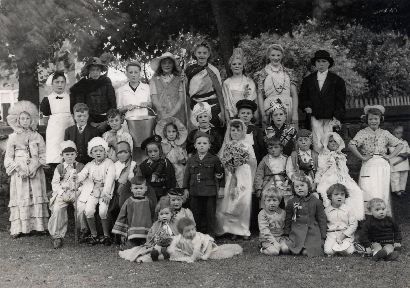 In addition to the very patriotic costumes including that wonderful army uniform, there seem to be two or three "Wee Willy Winkies" (pyjamas and a candle stick), two flower girls, a nurse, gypsies, a milkman and others. One little boy at the front seems to have missed out on a costume - he looks a bit upset. Someone in the back row looks as if they would rather have done without their costume, which I think may be "Old Mother Riley".