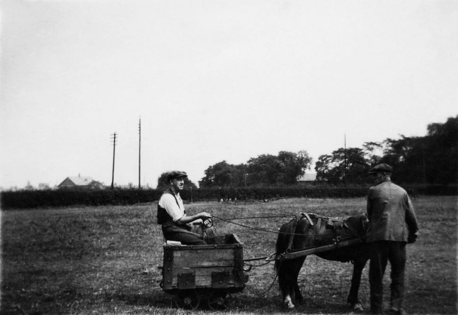 This photo was taken at Netherton in the 1930s. They're obviously getting the pony used to the harness and pulling the weight of a loaded tub. The pony isn't ready to be taken underground yet because it still has a full tail. All the working pit ponies had their tails docked and manes hogged, clipping the long hair off to avoid the risk of it getting caught in machinery.