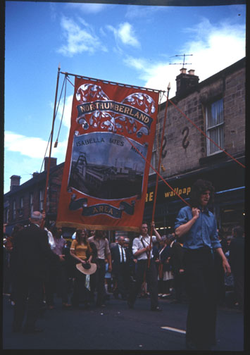 Procession carrying Isabella Bates Branch N.U.M. banner, Bedlington Miners' picnic 1960
