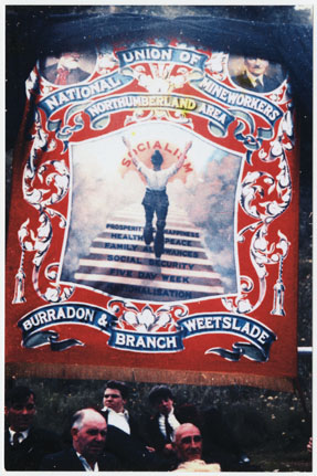 The photograph is of the Burradon and Weetslade Branch banner, the banner is draped in black cloth signifying that a lodge member has died following an accident at the colliery. 1961